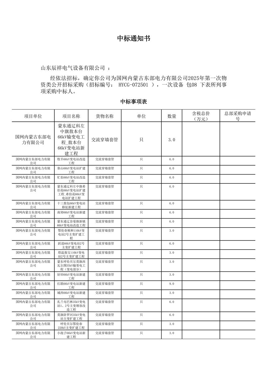 • 2025.02.14 110kV瓷絕緣穿墻套管中標通知書